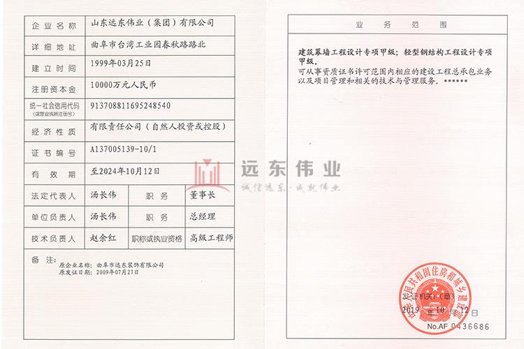 建筑幕墻工程設計專項甲級 輕鋼鋼結構工程設計專項甲級 2023-09-13 09:24:07 上一條:工程設計資質(zhì)證書 下一條: 建筑幕墻資質(zhì) 相關資訊 夯實基礎·砥礪奮進 | 重慶龍... 正在施工的和新承接的項目情... 近年完成的類似項目情況表... 關于加強項目部農(nóng)民工工資支... 熱門推薦 黃海明珠中心 濟寧運河城 開發(fā)區(qū)萬達廣場 中國重汽濟寧商用車有限公司