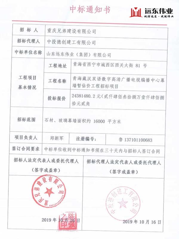 青海藏漢雙語數(shù)字高清廣播電視編播中心幕墻工程、中標通知書(鄭新軍) ... 產品詳情 上一條:泰安文旅健身中心 下一條: 暫無 推薦產品 黃海明珠中心 濟寧運河城 開發(fā)區(qū)萬達廣場 中國重汽濟寧商用車有限公司